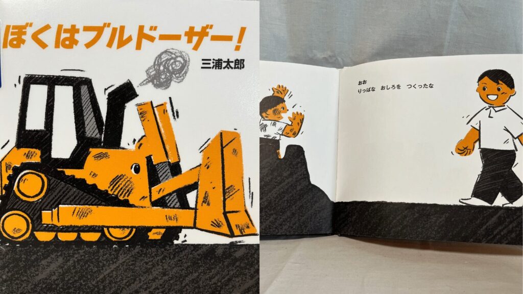 こちらの本は砂場遊びをしながら男の子がブルドーザーやパワーショベルになりきって遊ぶ様子がダイナミックに描かれている絵本です。オノマトペが豊富で楽しく読めますし、文章の量もストーリーを感じるページと「僕はタンクローリー!」とシンプルな言葉が書かれているページとが交互に展開していくので飽きないかつ満足できる分量です。