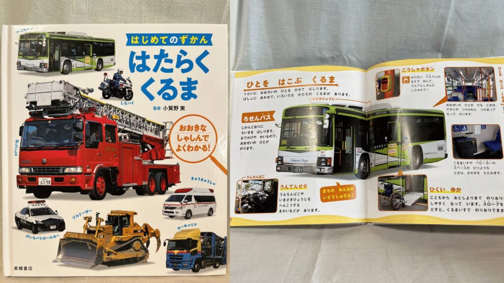 また、図鑑系の本もいくつか試してみましたが、初めて手に取った図鑑は車両の種類が多すぎて親の私でも知らない車がたくさん。「これはもう少し大きくなってからかな・・・」と感じたこともあります。