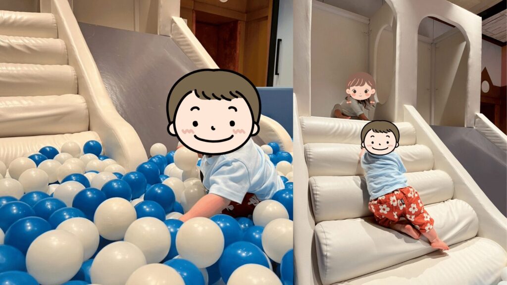 宿泊中、私たちが一番利用したのが キッズルーム。広々としたスペースにはクッション性のある柔らかい素材で作られた大きな滑り台、その下は広々ポールプールが広がっています。その他にもおもちゃなど1歳児から安心して遊べるアイテムが揃っていました。床もやわらかい素材で転んでもケガの心配が少ないのが嬉しいポイント。